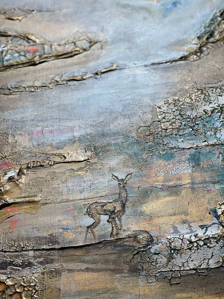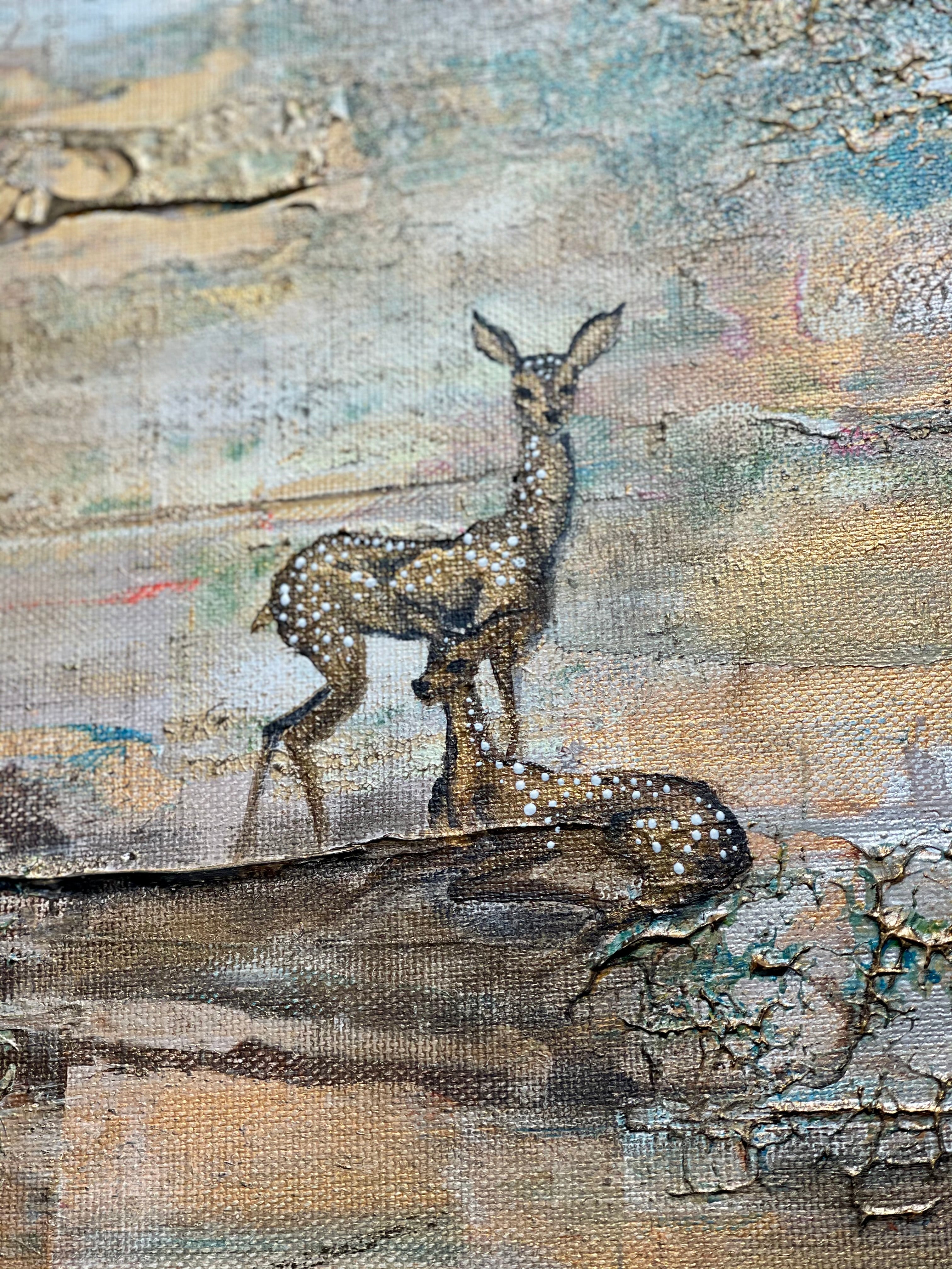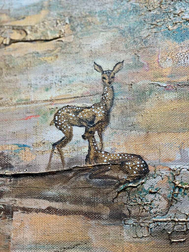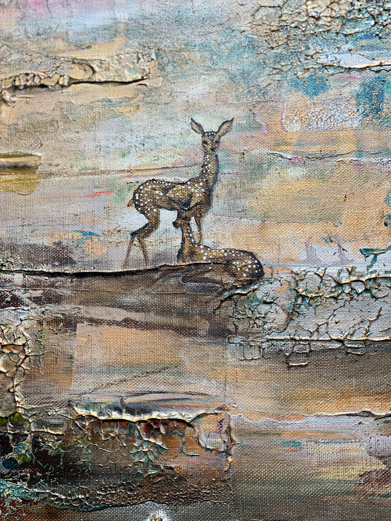 Inspirerad av Stockholms skärgård med sitt grönska. I den här målningen vill jag skildra det dramatiska vädret som kan uppstå under sommaren på öarna i skärgården. Jag föreställer mig att solen skiner genom regn och att de två hjortarna i målningen söker skydd i naturen.