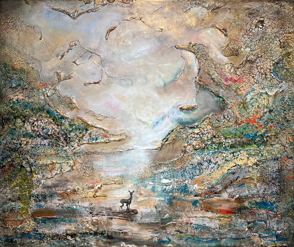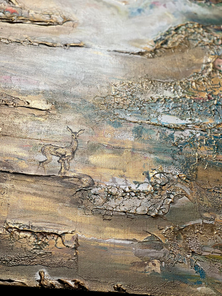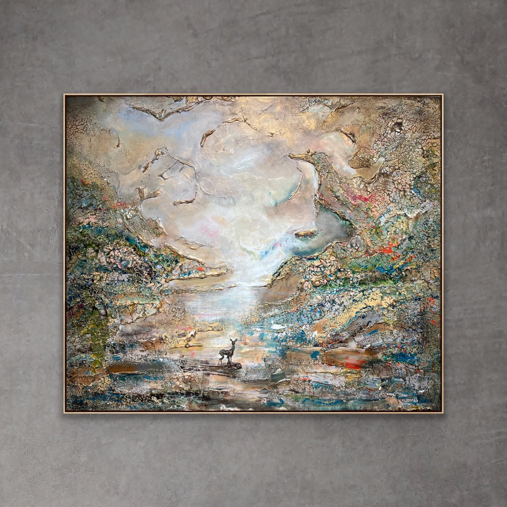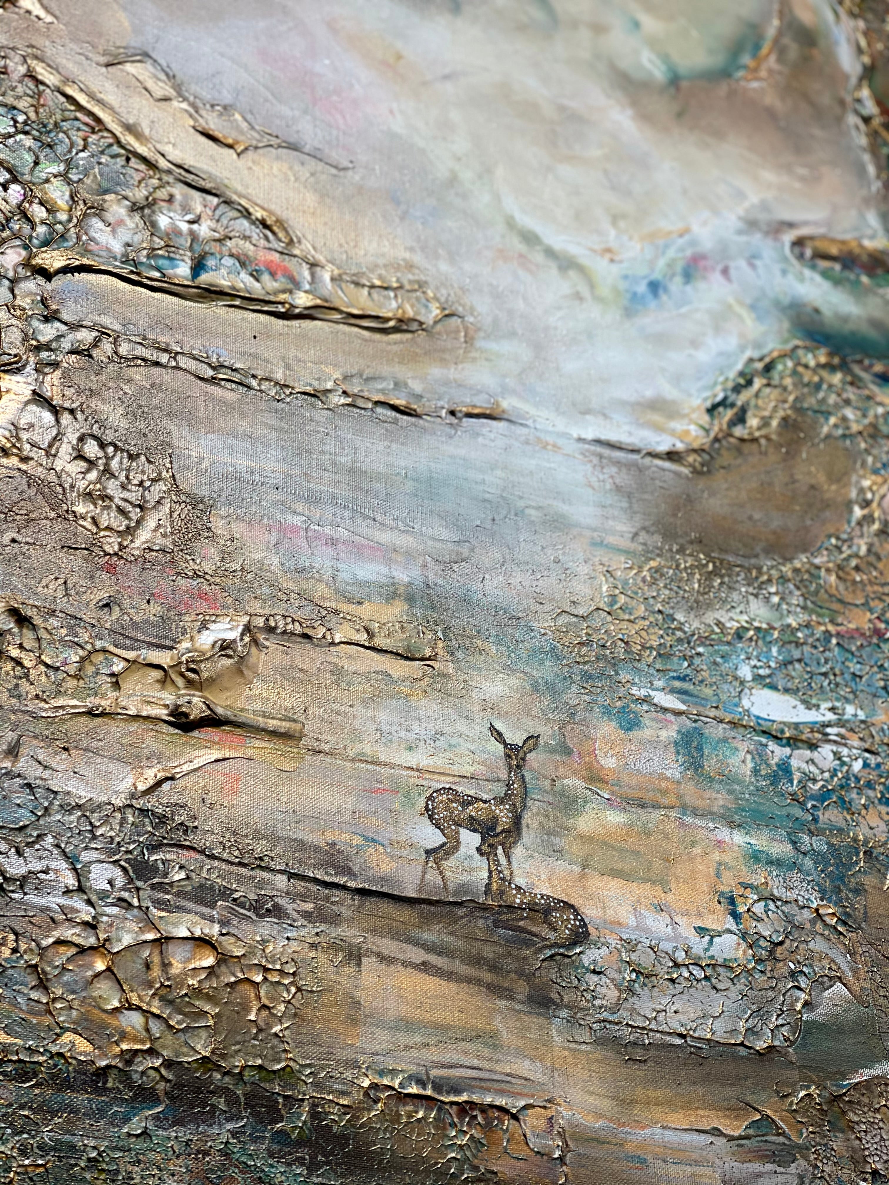Inspirerad av Stockholms skärgård med sitt grönska. I den här målningen vill jag skildra det dramatiska vädret som kan uppstå under sommaren på öarna i skärgården. Jag föreställer mig att solen skiner genom regn och att de två hjortarna i målningen söker skydd i naturen.