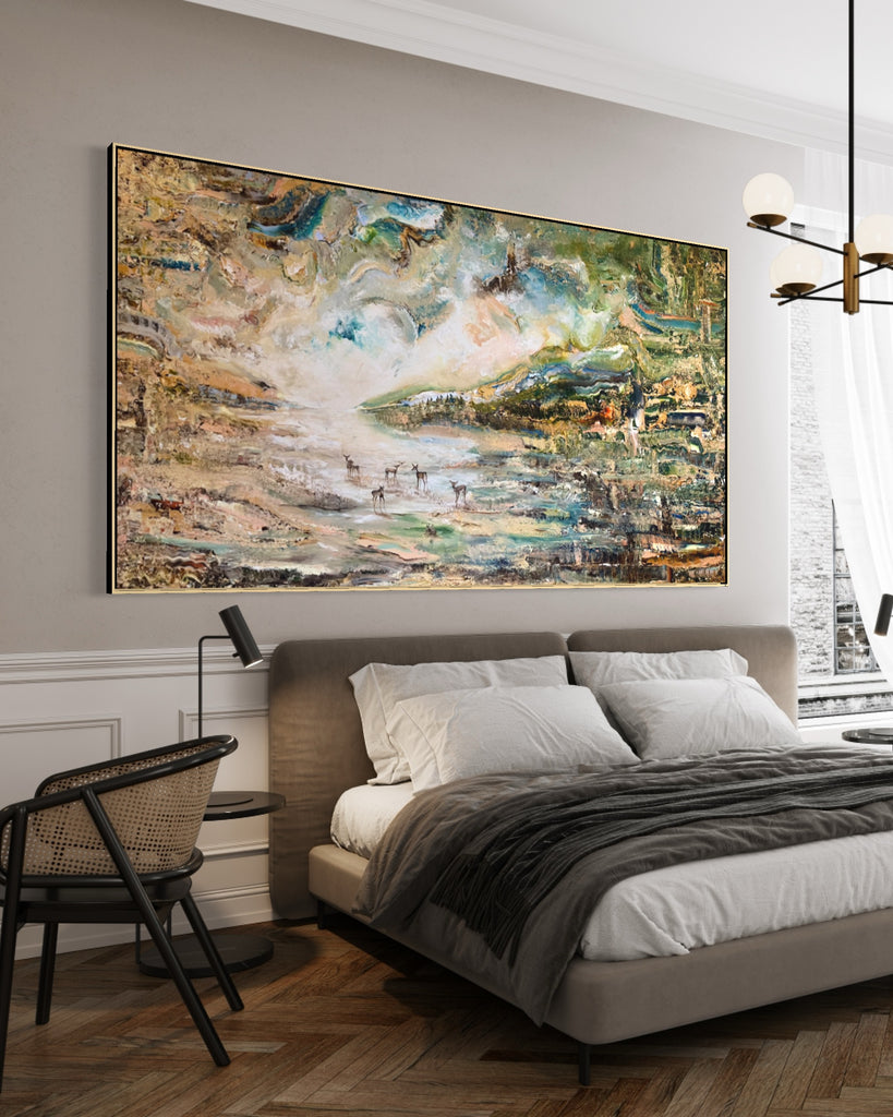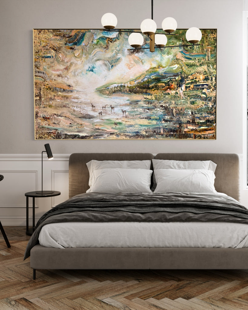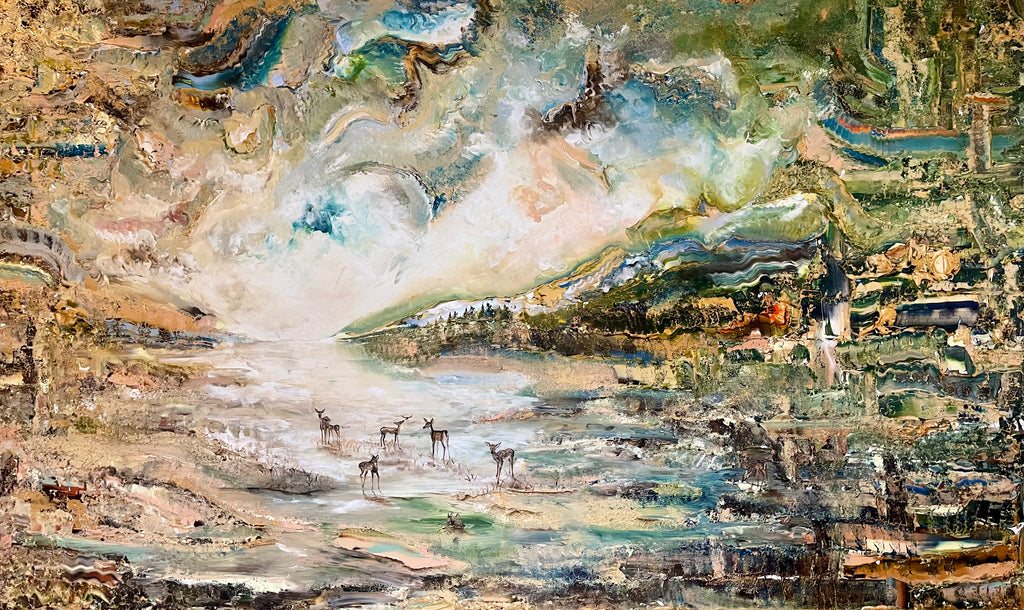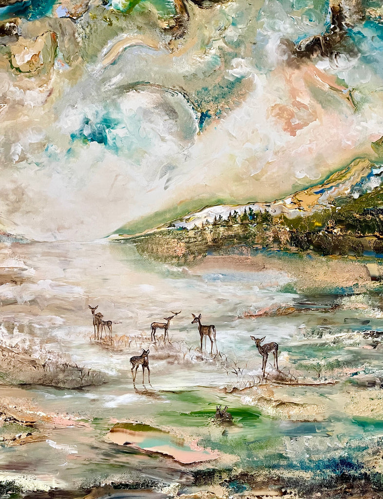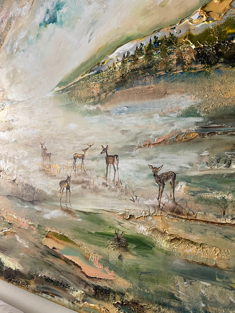 "The Heart of Djunrden" är den största målningen från utställningen Djurgrenden. Jag är så stolt över det här stycket och tror att det sätter tonen för resten av utställningen, eftersom den verkligen fångar min egen tolkning av den vackra Djururören. Målningen är väldigt lugn men ändå händelserik. Om du tittar noga kan du hitta några dolda detaljer.