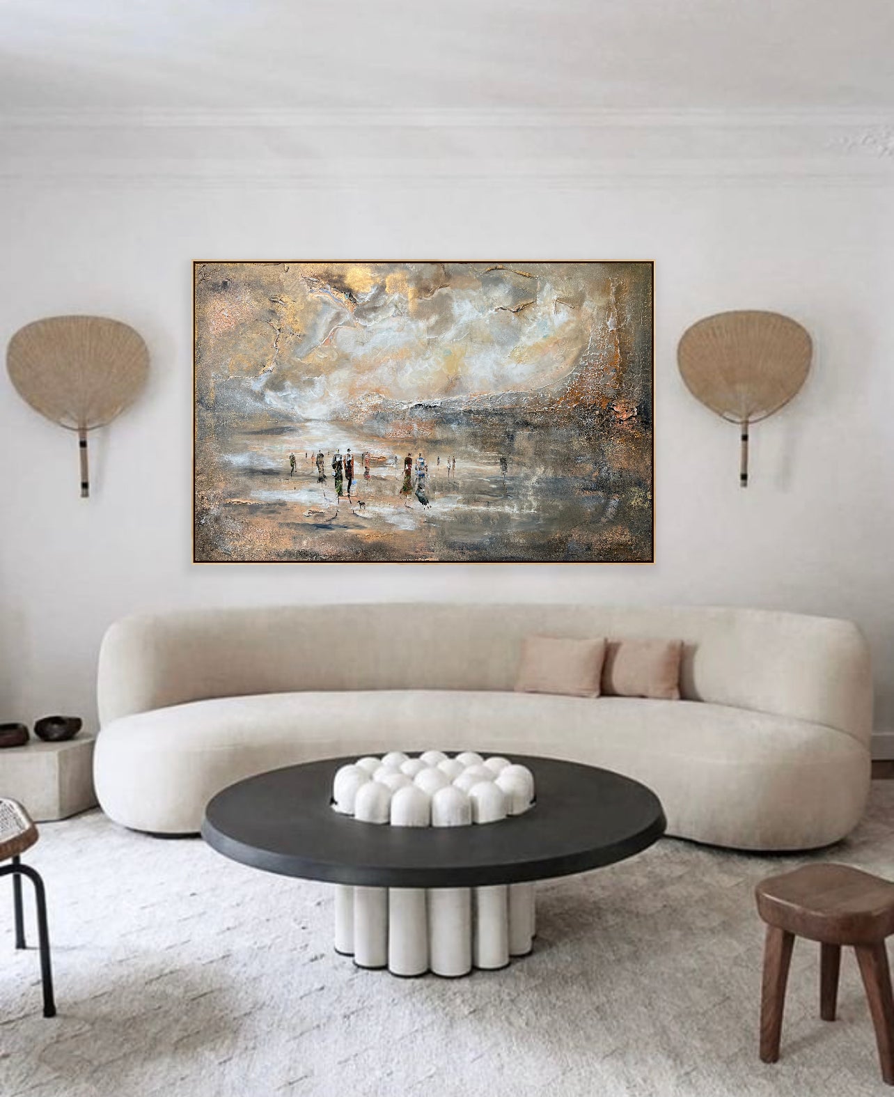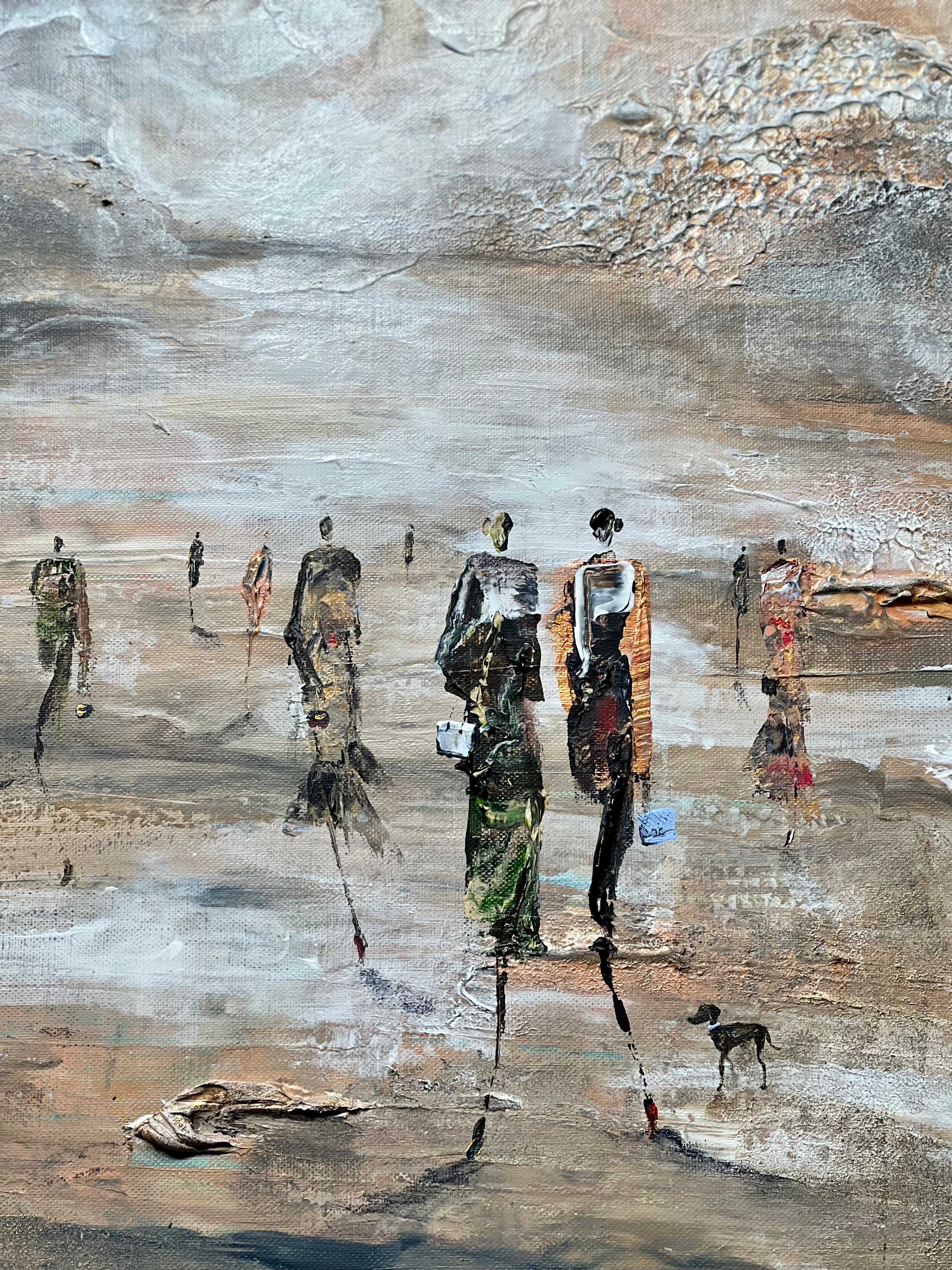 Villastaden är en av mina favoritplatser i Stockholm. Den har härlig arkitektur, och atmosfären är väldigt lugn. Jag tycker verkligen om att gå runt i området eftersom det ger mig mycket inspiration. I den här målningen har jag arbetat mycket med ljuskällan och siffrorna, som har fashionabla kläder och är mycket detaljerade. De som används är ganska lätta och de går i mer jordnära toner.